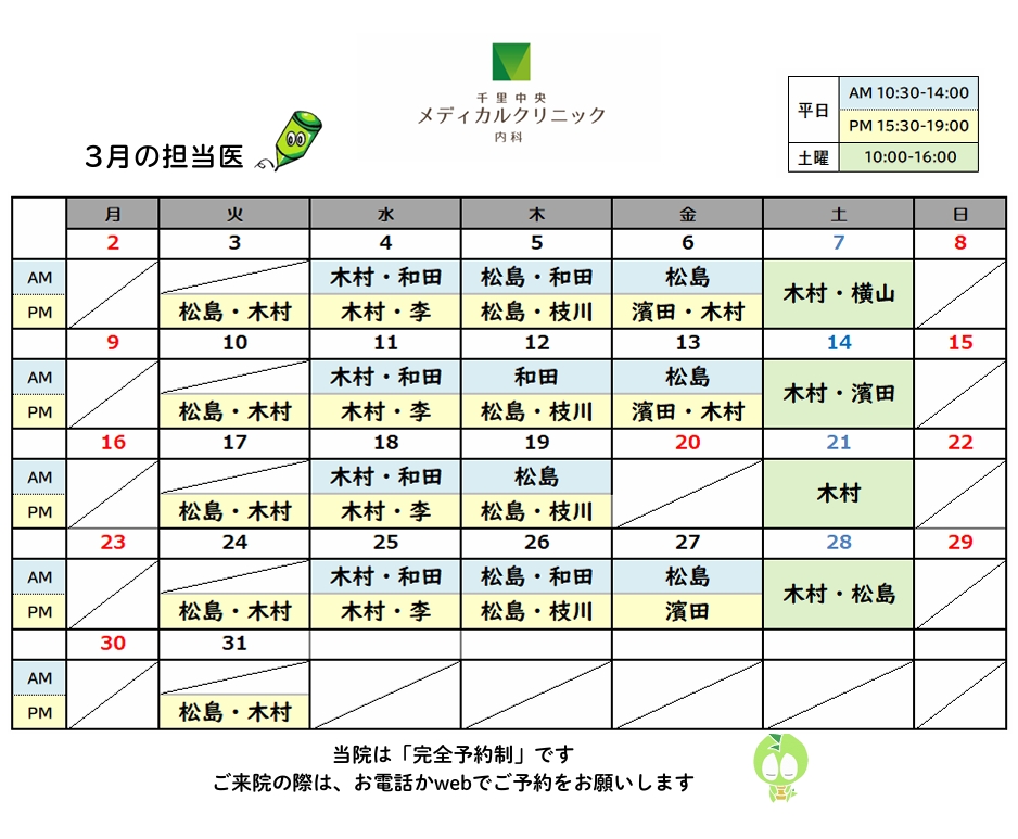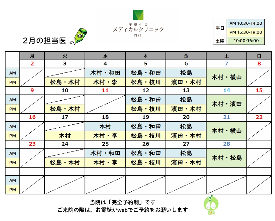 お知らせ【2月・3月】担当医表と休診日2025.09.102月の担当医表とお休み・循環器外来は、横山 医師、李 医師となります。・17日火曜日の睡眠外来は、休診となります。・11日水曜日は、建国記念の日のため休診となります。3月の担当医表とお休み・循環器外来は、横山 医師、李 医師となります。・20日金曜日は、春分の日のため休診となります。 この記事のタイトルとURLをコピーする 2025年8月栄養だより前の記事 2025年9月栄養だより次の記事